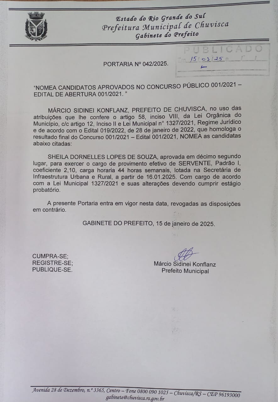 CONVOCA, PARA COMPARECEREM PARA ACEITAÇÃO DA VAGA, a partir de 16 de janeiro de 2025, na Prefeitura Municipal de Chuvisca, sito Avenida 28 de dezembro, nº 3365, Centro, o candidato aprovado no Concurso Público Edital 01/2021, citado na Portaria 42/2025.