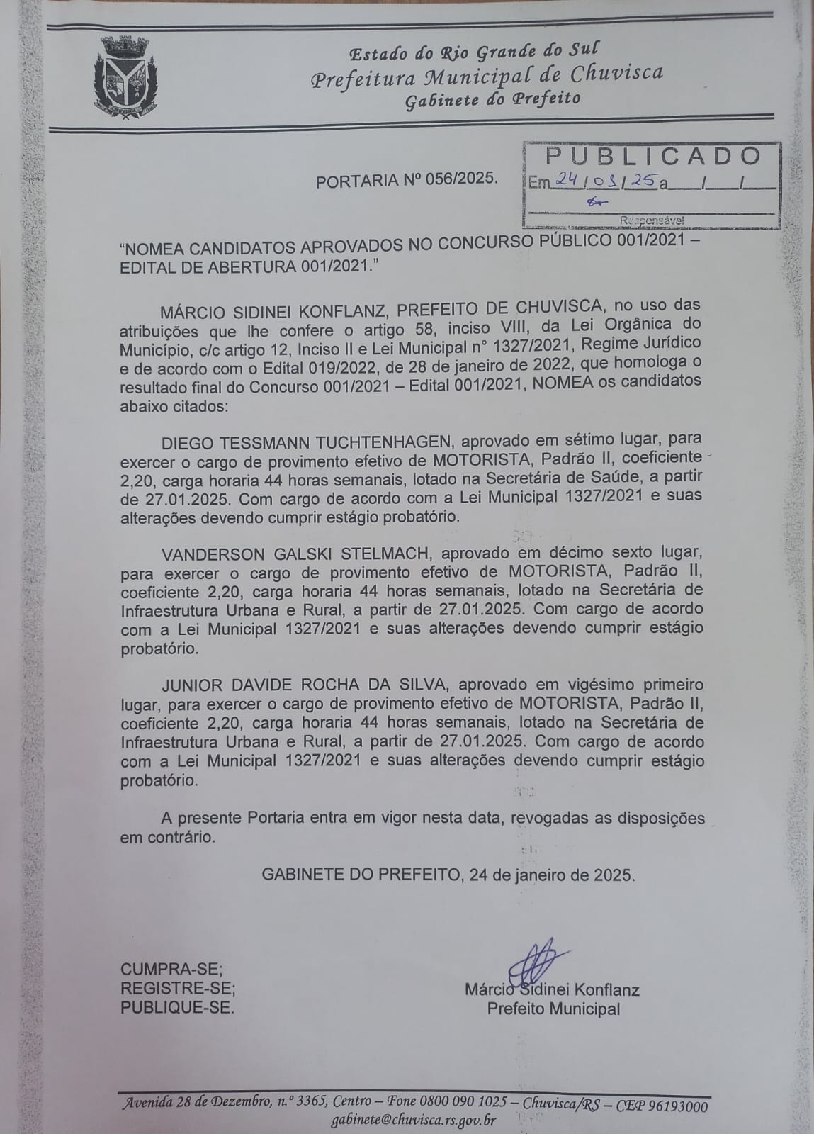 CONVOCA, PARA COMPARECEREM PARA ACEITAÇÃO DA VAGA, a partir de 27 de janeiro de 2025, na Prefeitura Municipal de Chuvisca, sito Avenida 28 de dezembro, nº 3365, Centro, o candidato aprovado no Concurso Público Edital 01/2021, citado na Portaria 56/2025.