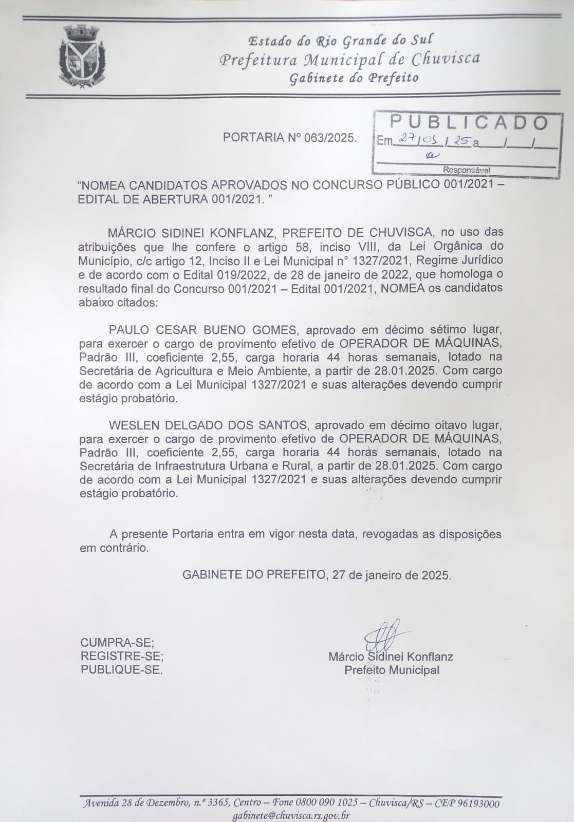 CONVOCA, PARA COMPARECEREM PARA ACEITAÇÃO DA VAGA, a partir de 28 de janeiro de 2025, na Prefeitura Municipal de Chuvisca, sito Avenida 28 de dezembro, nº 3365, Centro, o candidato aprovado no Concurso Público Edital 01/2021, citado na Portaria 063/2025.