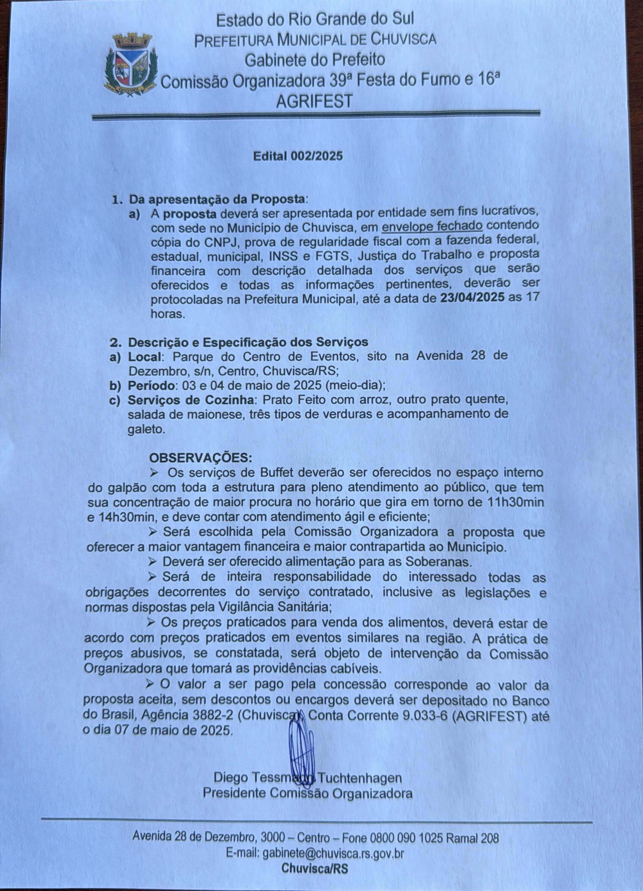 As propostas devem ser protocoladas na Prefeitura até o dia 23/04/2025 as 17 horas.
